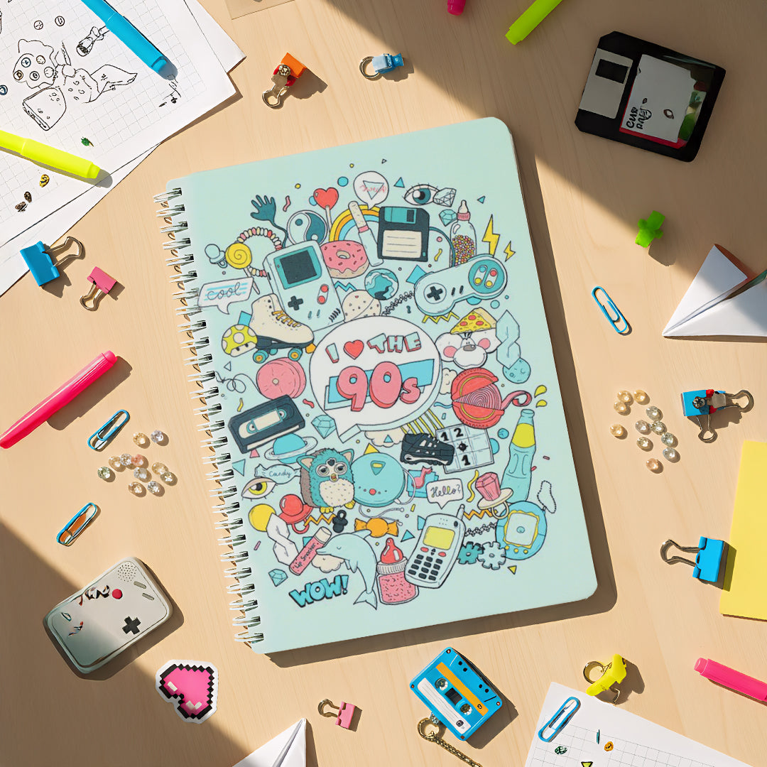 The I Love 90's Softbound Wiro B5 Notebook is a must-have for any 90's fan! Featuring a sturdy wiro binding and B5 size, this notebook makes writing and organizing a breeze. Perfect for journaling, note-taking, and more. Relive the nostalgia of the 90's with this stylish and functional notebook.
