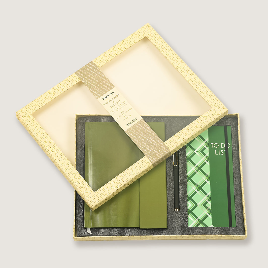 Each hamper comes packed in a sleek gift box with premium-quality stationery essentials: