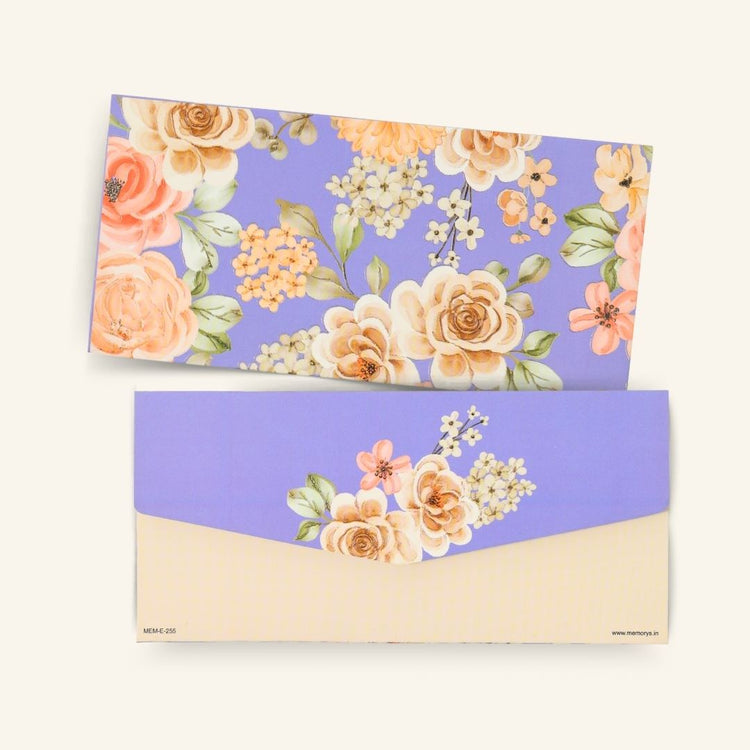Soft lavender background decorated with pastel roses makes this envelope a graceful choice for elegant occasions.