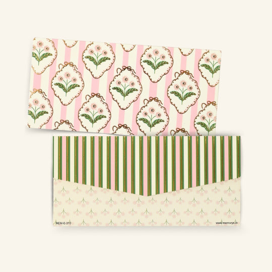 A pink and cream trellis pattern with floral bouquets gives this envelope a touch of vintage romance.Size: 7.25" X 3.75" [185 mm X 93 mm]Paper: 250 gsm SBS BoardPrinting: 4 + 2 Color Printing with Raised...Regular price Rs. 299.00 -