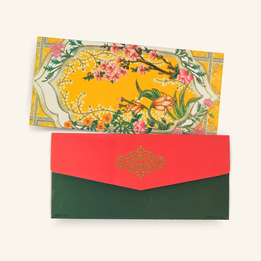 A bright yellow background with floral arch detailing gives this envelope a cheerful and festive appeal.Size: 7.25" X 3.75" [185 mm X 93 mm]Paper: 250 gsm SBS BoardPrinting: 4 + 2 Color Printing with Raised Gold...Regular price Rs. 299.00