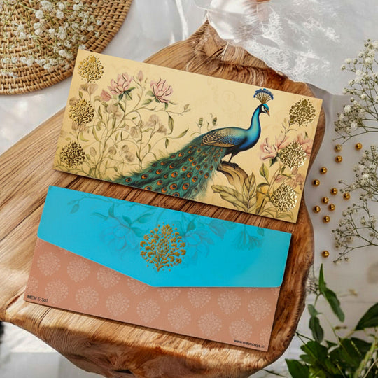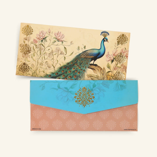 A graceful peacock illustration set on a beige background makes this envelope a timeless classic.Size: 7.25" X 3.75" [185 mm X 93 mm]Paper: 250 gsm SBS BoardPrinting: 4 + 2 Color Printing with Raised Gold Foil...Regular price Rs. 299.00 -