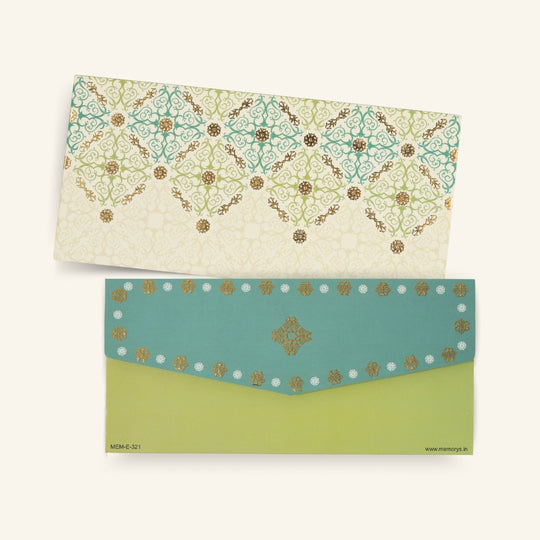 Mint green with floral framed panels gives this envelope a fresh and delicate elegance.Size: 7.25" X 3.75" [185 mm X 93 mm]Paper: 250 gsm SBS BoardPrinting: 4 + 2 Color Printing with Raised Gold Foil enhancementLamination:...Regular price Rs. 299.00 -